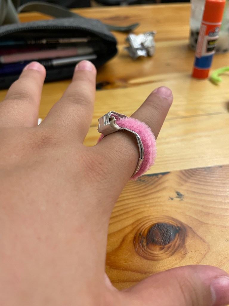 After many prototypes, I found that the best materials I had available to me at the moment were a pipe cleaner and some duck tape. After quite a bit of trial and error, I was able to make a ring that was about the correct size. The final prototype wasn’t perfect, as the pipe cleaner didn’t quite spin as well as I wanted it to.
