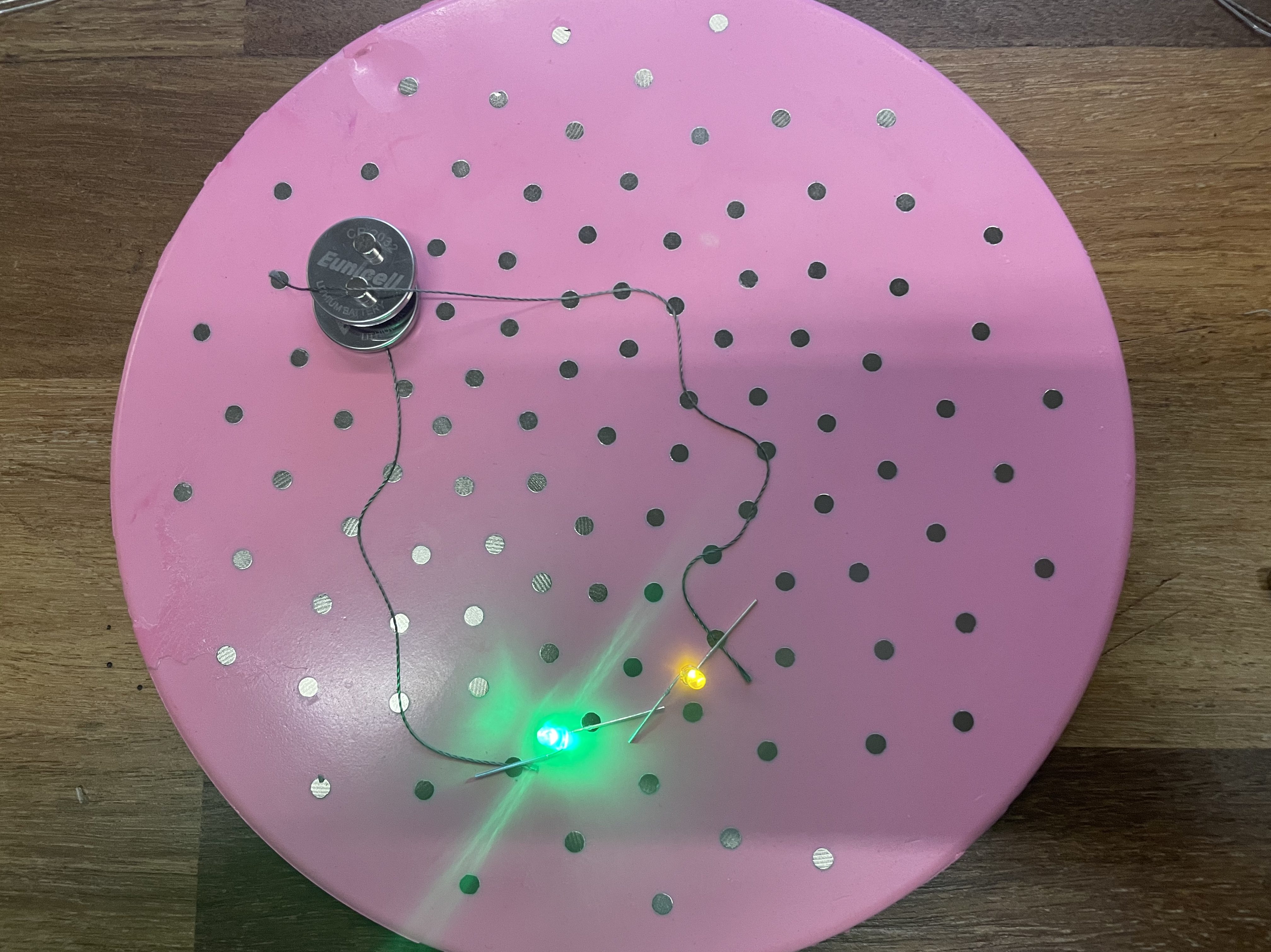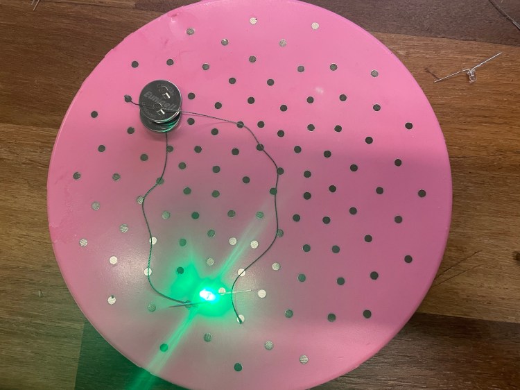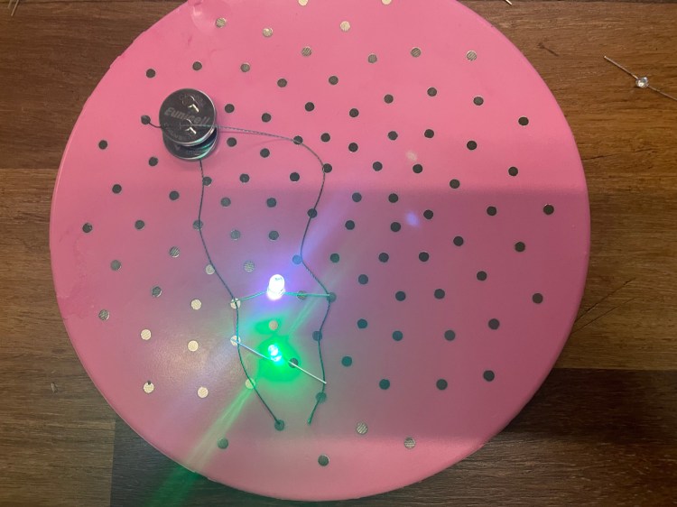 Week one focused around building circuits on a thread board. Other supplies used were string, LEDs, and 2V batteries. I experimented with different numbers of batteries, numbers and colors of LEDs, and string paths to create different circuits.