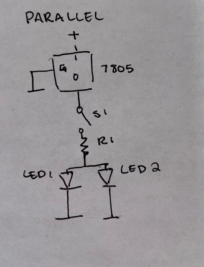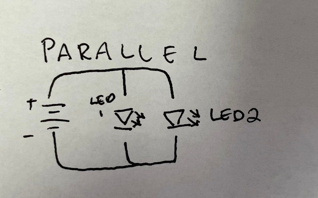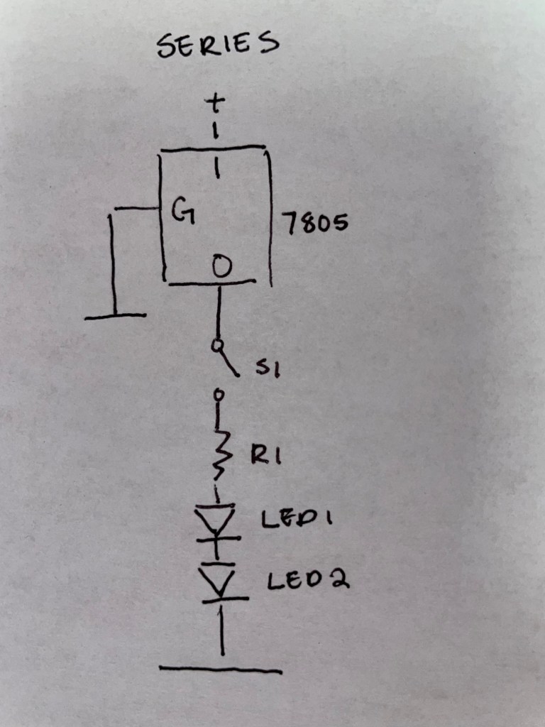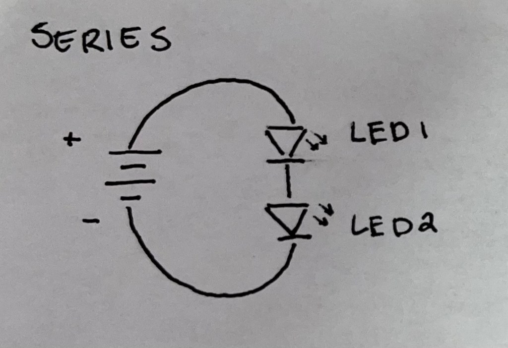 The math of Ohm’s law was also introduced in this week’s lab, as a resistor was needed to protect the LEDs on the circuit. We calculated resistance using the formula of R=V/I, and while the resultant needed resistances of the parallel and series circuits were different, a 47-ohm resistor was used in both instances due to the fact that it was the resistor available in class which had a resistance closest to both calculated numbers.