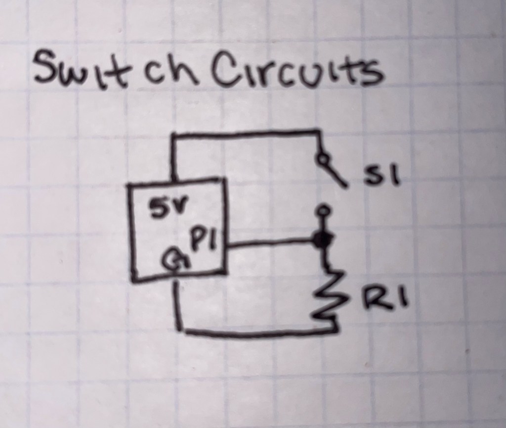 I found the content of this week rather challenging, as there were four complete circuits that needed to be made in order to create the full system with two switches controlling separate LEDs. Much like the last lab, drawing out circuit diagrams came to my rescue and helped me find where I continually went wrong.