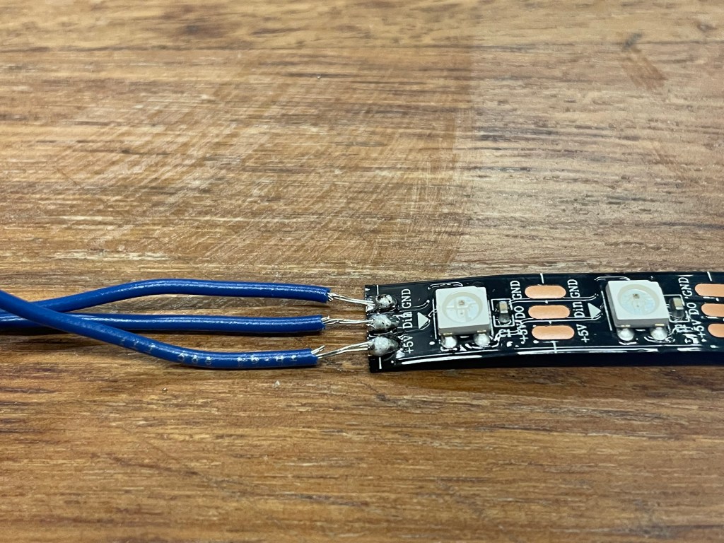 This week was my first time soldering, and while it took a few tries to get the hang of it (and get my hands to stop shaking), I am proud of myself for being able to solder wires onto the LED strip in such a way that the electrical connection works.