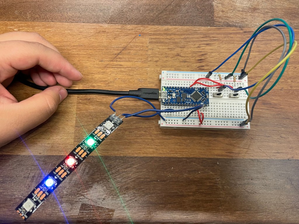 The circuits used were a simplified version of last week’s circuits, as the LED strips have built in resistors. Instead of one circuit for each LED, the LED strip could simply be plugged directly into the breadboard. In addition, the two circuits used for the switches did not need to be changed whatsoever.