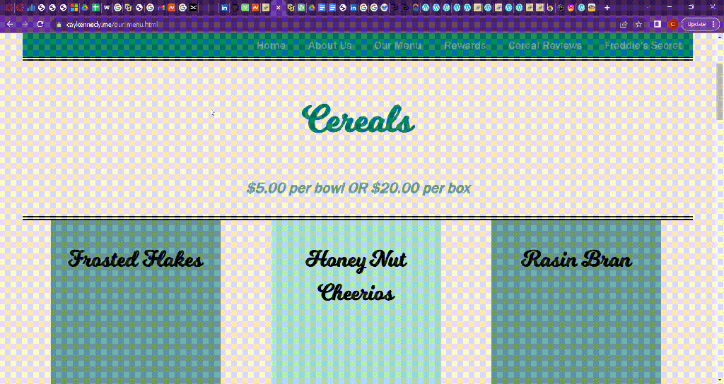 Freddie’s Secret Cereal Lounge started as a running joke with my friend group, as we all had a habit of eating cereal at 3am on the floor of my old dorm while being watched by the plastic skeleton I kept as décor, Freddie. When I was tasked with creating a website for my first web development class, I knew I had to make this running joke its own website.