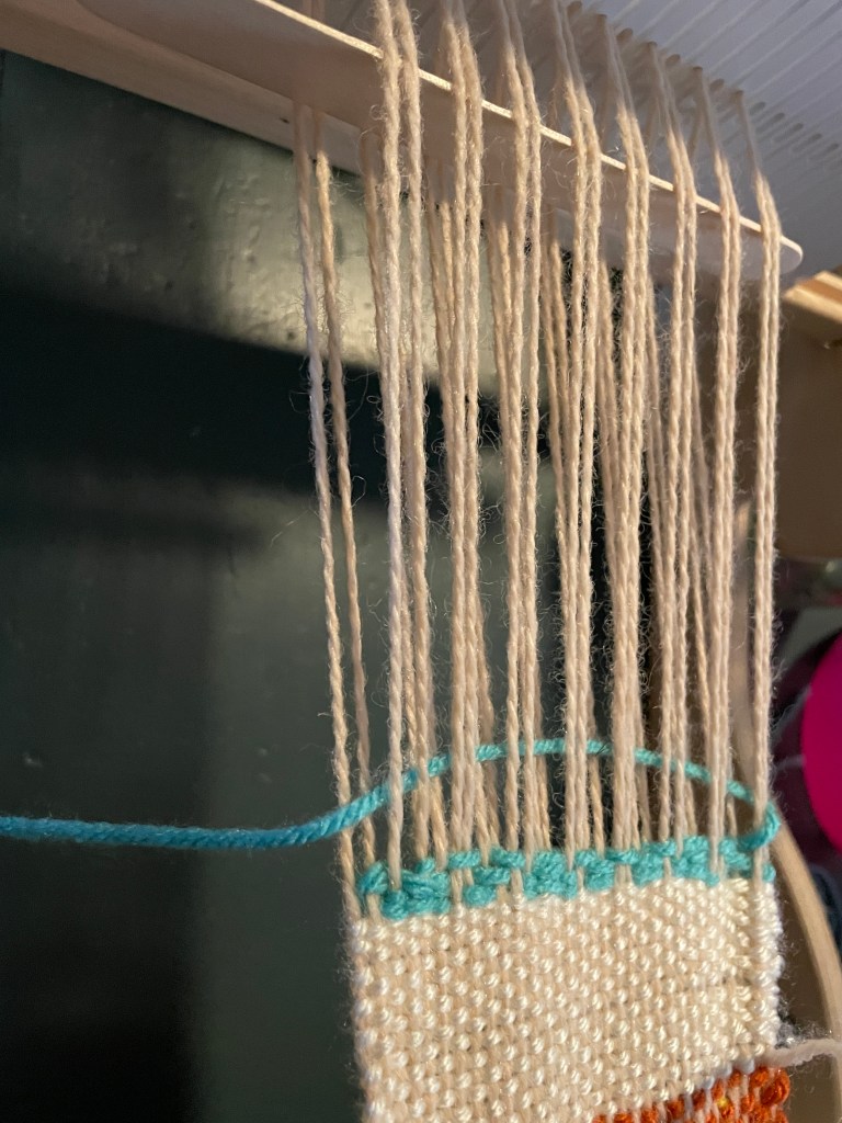 For my second swatch, I used adacad to draft a simple overshot structure, and followed the draft. I found that I often lost track of which row I was supposed to be doing, and it was at times difficult to make sure the correct warps were raised, as the structure was not plain tabby. I ended up using a popsicle stick as a supplementary heddle, which was far more useful than weaving in and out like I did for the first swatch. I also tried to make an eye with some inlays, and incorporated the electromagnet in the middle of that.
