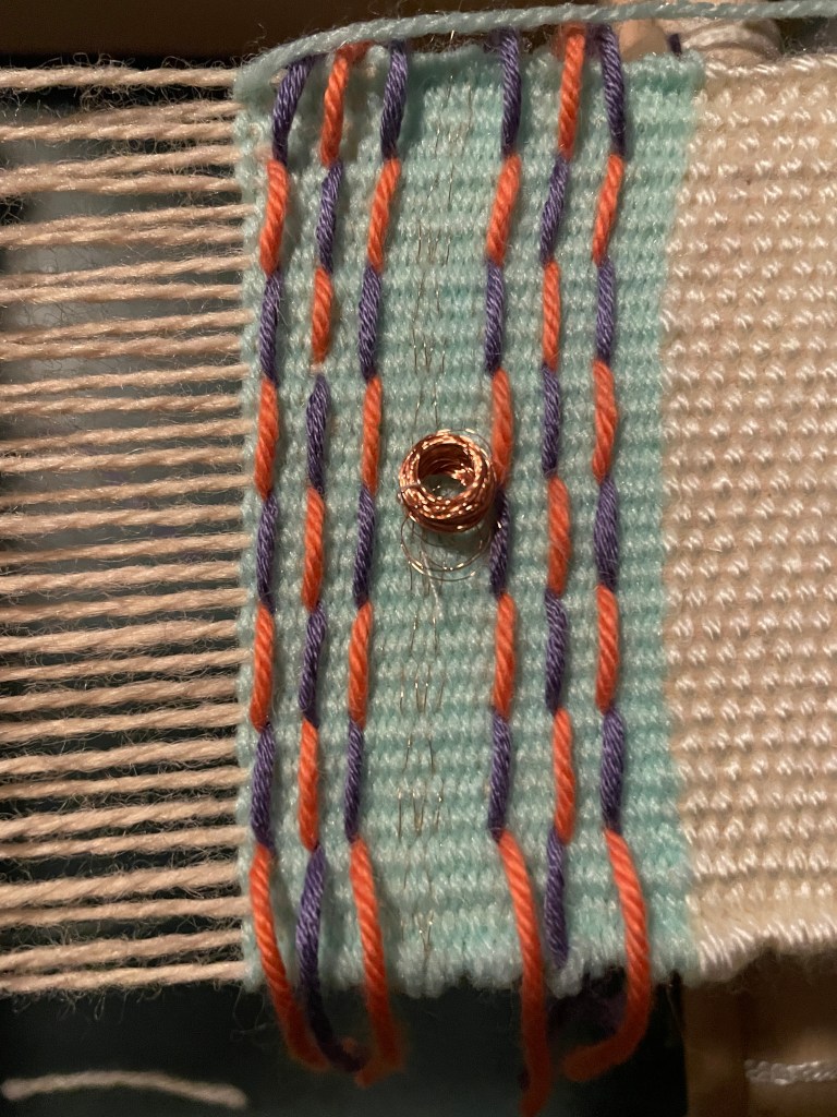 For my first swatch, I worked in tabby while using inlays in a semi-overshot style, though varied how many rows of tabby were woven between decorative wefts. In the end, my swatch was shorter than I wanted it to be and the electromagnet did not sit exactly the way I wanted it to sit, though I did like the decorative incorporation of the ends of the copper wire.