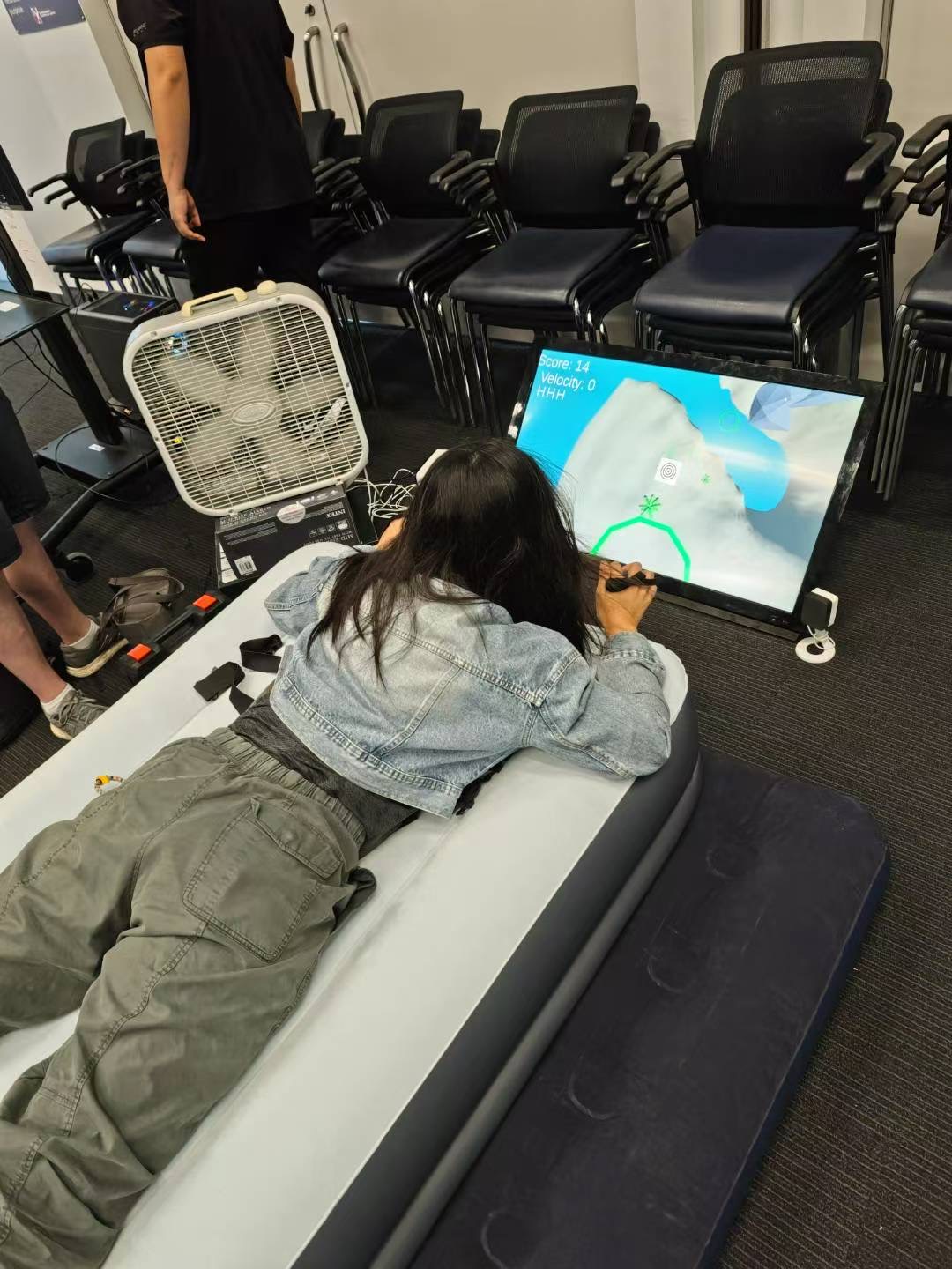 While we liked the instability of the air mattress, we wanted more instability and we wanted the user to be farther away from the screen and the ground. We first tried propping the air mattress up on chairs, however this ended up with the player not being supported in the middle, which was not ideal for our goal.