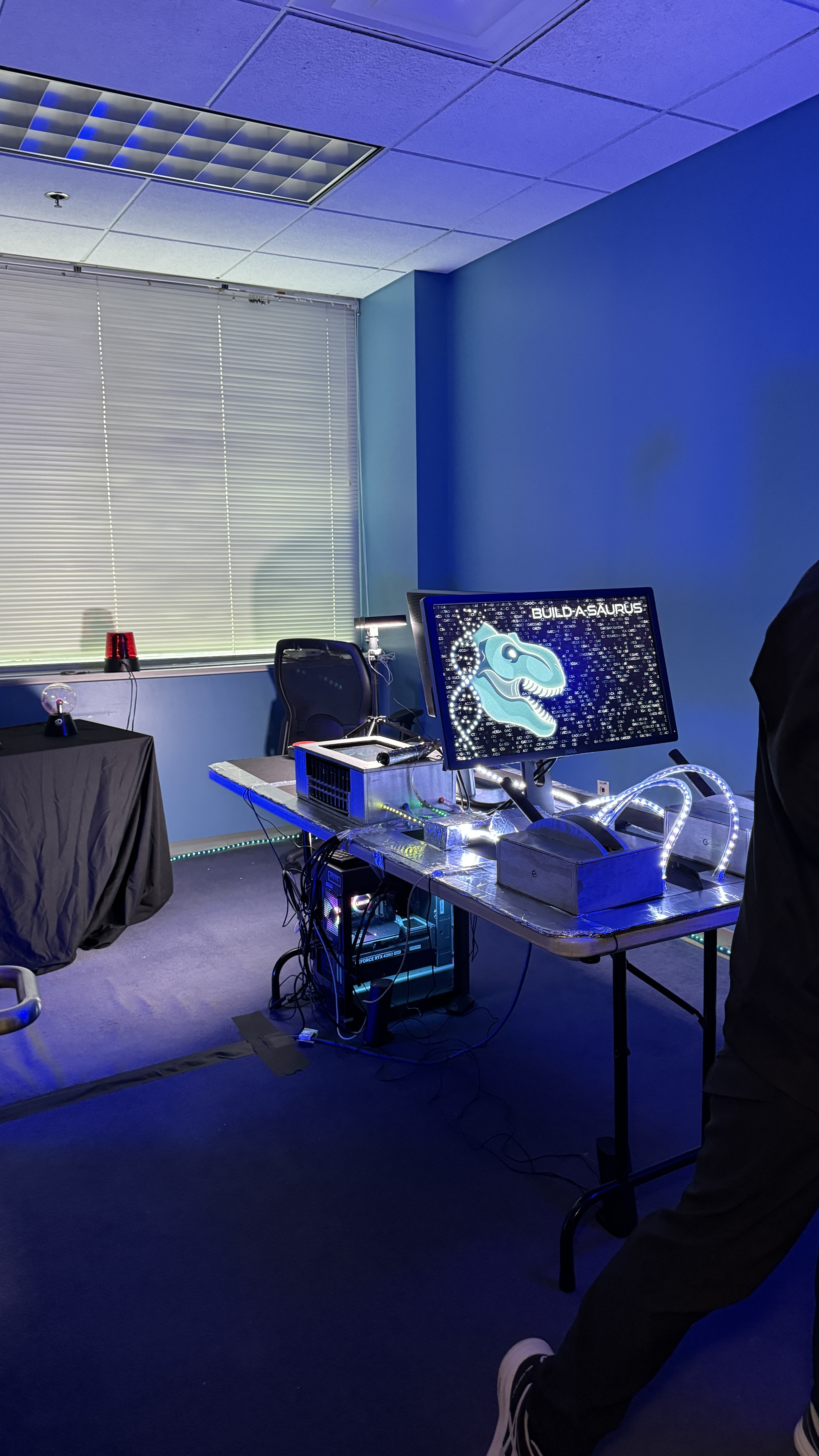 We built the experience itself on one table, which had three screens connected to a single computer. We used arduino for inputs and physical lighting and unity to run the experience.