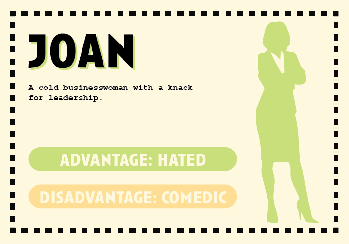 At the beginning of the game, players get a character card which tells them the traits of their character, where they gain points if they play cards that are advantageous to their character and they lose points if they play cards that are disadvantageous for their character.